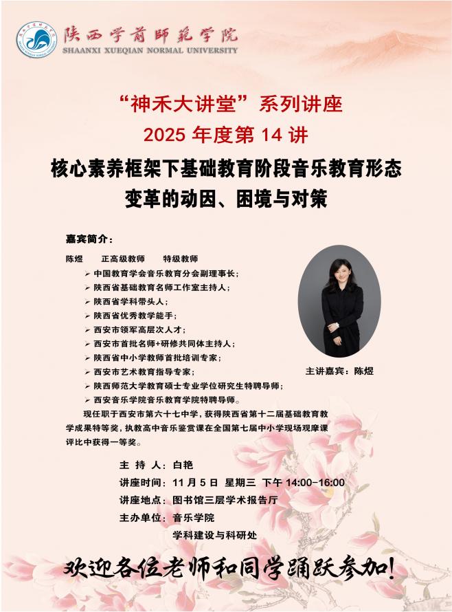 2025年1 1 月 5 日下午,我校“神禾大讲堂” 第14期在 图书馆报告厅成功举办。本次活动特邀中国教育学会音乐教育分会副理事长 , 陕西省基础教育名师工作室主持人,陕西省学科带头人、陕西省优秀教学能手 , 西安市第六十七中学特级教师陈煜, 为师生带来了题为 “ 核心素养导向下中学音乐教学方式变革的思考 ” 的精彩报告 。 现场座无虚席,气氛热烈,与会师生共同经历了一场关于音乐教育未来发展的思想洗礼。