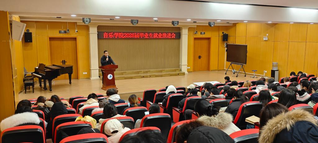 为扎实推进2026届毕业生就业工作,帮助毕业生明确就业形势、明晰求职方向,2026年1月4日上午,音乐学院在二教C1教室召开2026届毕业生就业推进会。2026届全体毕业生参会,辅导员黄自波通报当前就业基本情况,学院党委副书记解跃出席会议并发表讲话。