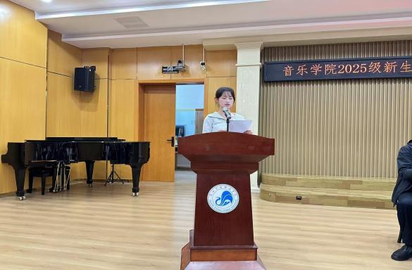 2025级舞蹈2班张新聆同学作为新生代表发言。她表达了踏入大学校园的激动与憧憬,并代表全体新生承诺,将珍惜时光、刻苦学习、勇于实践,不负师长厚望,努力成长为一名优秀的音乐人。