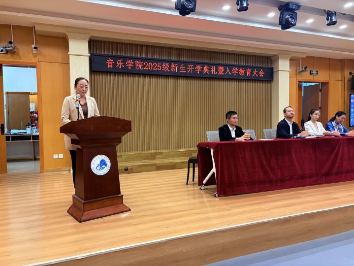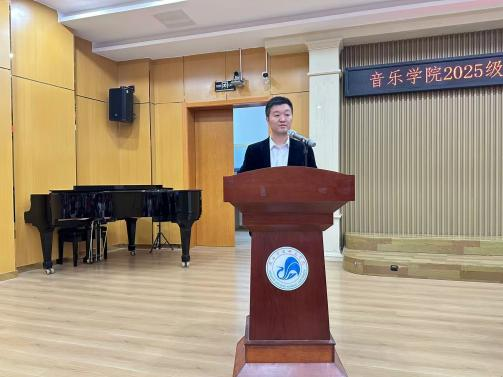 音乐学院院长葛晓妮发表了热情洋溢的致辞。她代表学院对全体2025级新生的到来表示最热烈的欢迎,并围绕音乐学专业优势,师资力量,人才培养特色,教育教学成果为主题开展来讲,鼓励大家在音乐的殿堂里勤学苦练,涵养品格,谱写无悔的青春乐章。