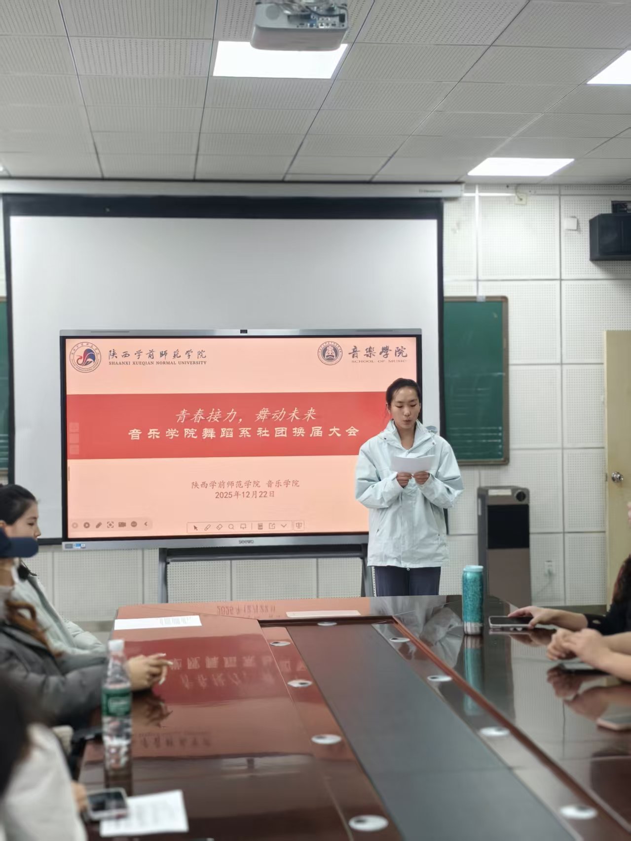 2025年12月22日,音乐学院舞蹈系神禾舞蹈社团、跃动腰鼓社团及服装室管理负责人换届大会在三教607顺利举行。音乐学院副院长赖琼琼、舞蹈系主任李健及指导教师李丽莎、王晨露、苏浩然出席,李健老师主持会议。本次大会旨在选举新一届核心负责人,为社团发展注入新活力,社团全体成员参会。