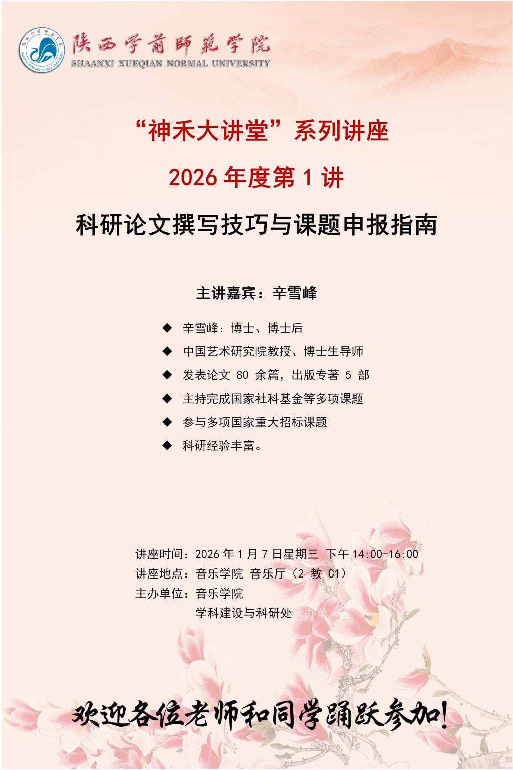 1月7日14:00,陕西学前师范学院“神禾大讲堂”2026年第一讲在大学生艺术实践中心(2教C1)顺利举行。本次讲座特邀中国艺术研究院教授、博士生导师辛雪峰,以“科研论文撰写技巧与课题申报指南”为题展开深入讲解,助力学院老师提升科研能力,音乐学院副院长白学良主持讲座,吸引众多师生踊跃参加。