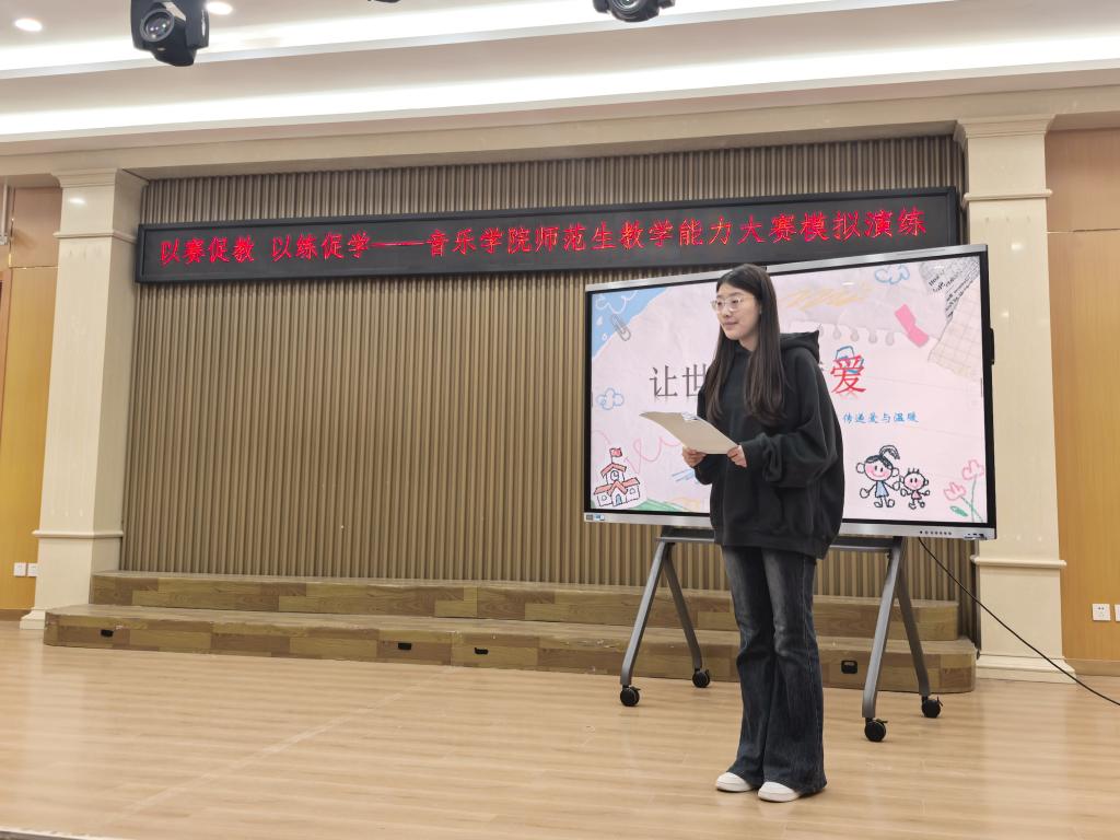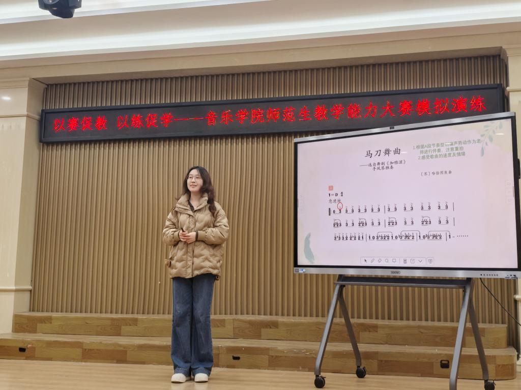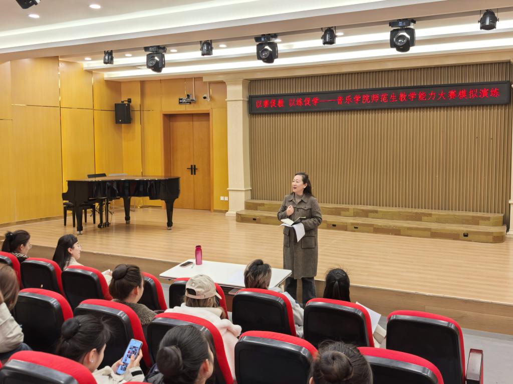 为进一步提升师范生教学能力大赛参赛水平,强化赛前指导效果,3月23日下午2点,音乐学院在2教C1教室组织开展了教学能力大赛赛前专项指导活动。本次活动特邀一线教学专家黄晨老师到场指导,吸引了120余名师生到场观摩学习,现场气氛热烈、反响良好。